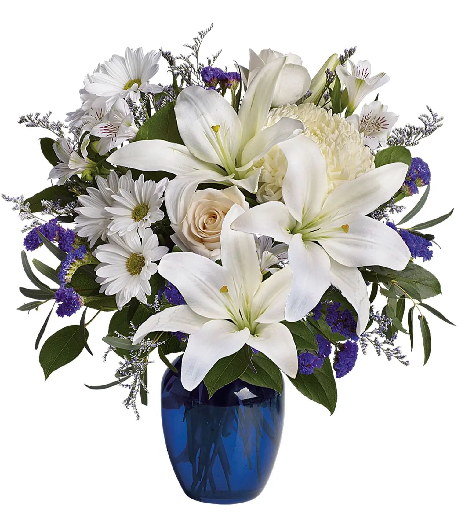In this arrangement, the serenity of the color blue along with the purity of intention symbolized by white will let the family know you are sending your calm strength to them during these difficult times