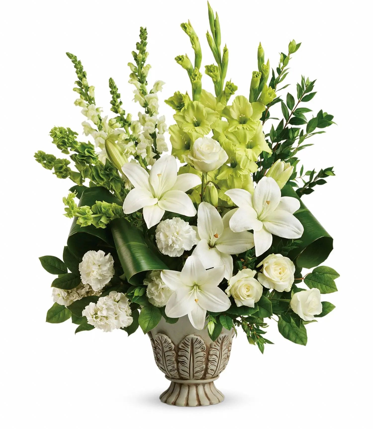 Peaceful and majestic in a large antiqued pot, this wondrous white arrangement is a touching tribute to a bright life, and your unending support.